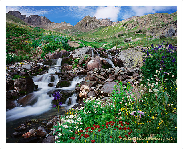As I worked my way up this stream flowing down the center of American Basin, I was very excited when I found this spot. Given the name of the area, I couldn't imagine anything more fitting than capturing the beautiful red, white, and blue flowers surrounded by majestic mountain peaks. Throw in a few Columbine and a cascading stream and I knew I had an instant classic. After composing, I resigned to waiting several hours for a lull in the steady breeze combined with a cloud passing overhead to soften the light, and I got it! |