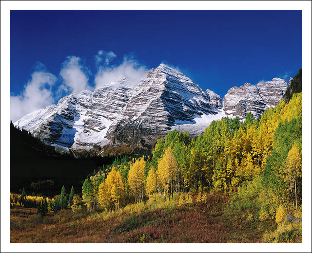 As autumn colors begin to show on the aspens beneath the Maroon Bells, these twin 14,000 foot peaks have just had their first winter dusting. An overnight storm that brought rain to lower elevations, coated the mountains in fresh snow. The morning fog has risen to reveal the beautiful mountains and to welcome a glorious autumn day. |