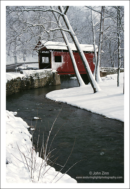 It was one of those peaceful nights when a steady snow silently blanketed everything under the sky. Waking to a winter wonderland, I knew the perfect location to capture the beauty of the fresh snow and headed out onto the unplowed roads. The Henry Bridge is one of two covered bridges located in Mingo Creek Park and has witnessed many a winter storm since it was built in 1881. I was fortunate to spend a quiet morning at the bridge seeing it dressed in red, surrounded by a landscape of white. Patiently waiting for the right moment, I took this shot just as the sun started to break through the clouds bringing a warmth that ended the dream in a few hours. |