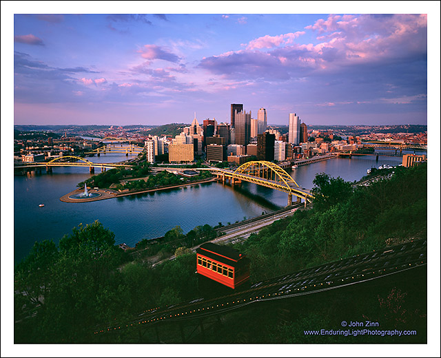 At the end of a beautiful summer day in Pittsburgh, the city basks in the light of the setting sun as the clouds above are highlighted with pink hues. |