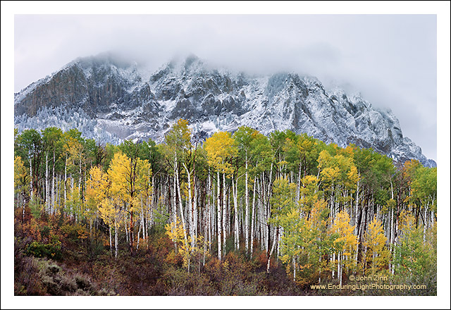 Change is a part of life and is as inevitable as the progression of one season to the next. Even after acknowledging that change will come, sometimes it begins before we expect it. Though the transition of autumn had only just begun to change the aspens to gold, an early and surprisingly heavy snowstorm brought a prelude to winter, accenting the dramaticly sculpted face of Marcellina Mountain and concealing its summit behind some low hanging clouds. |