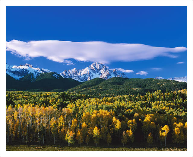 One of Colorado's 14,000 foot peaks, Mt. Sneffels majestically rises as king over the Sneffels Range in the San Juan mountains of southwestern Colorado. Almost as a crown, the peak is adorned with a lenticular cloud formed by early morning winds over the high-altitude mountain. This shot was taken shortly after "Fairyland Sunrise" but from a different vantage point. |